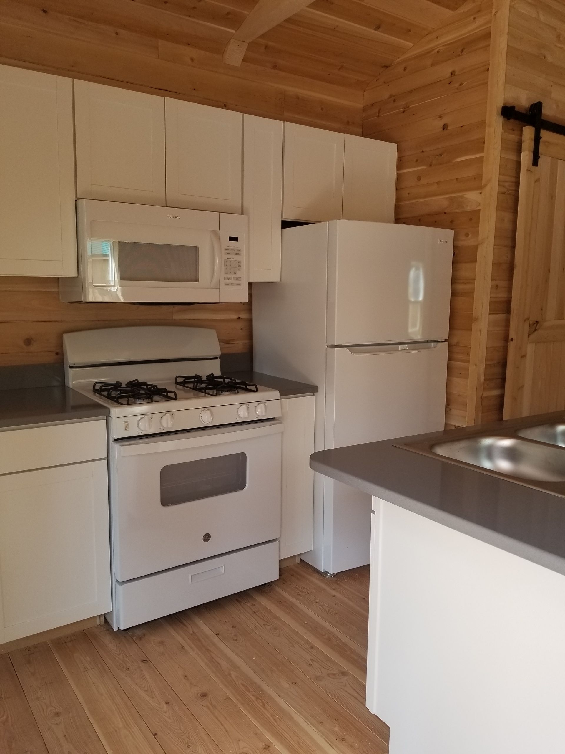 This 12x40, 480 square foot, cabin features one full bedroom, one sleeping loft, and one storage loft. Enjoy your meals in the dining nook with plenty of windows or sit at the kitchen island featuring quartz countertops. The kitchen is equipped with your essential appliances including an oven, refrigerator, and microwave. Custom-made cedar interior, sliding barn doors are featured in the cabin.